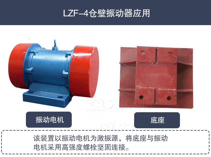 LZF-4倉壁振動器是應用振動電機的一個典型實例。該裝置以振動電機為激振源,將底座與振動電機采用高強度螺栓堅固連接。